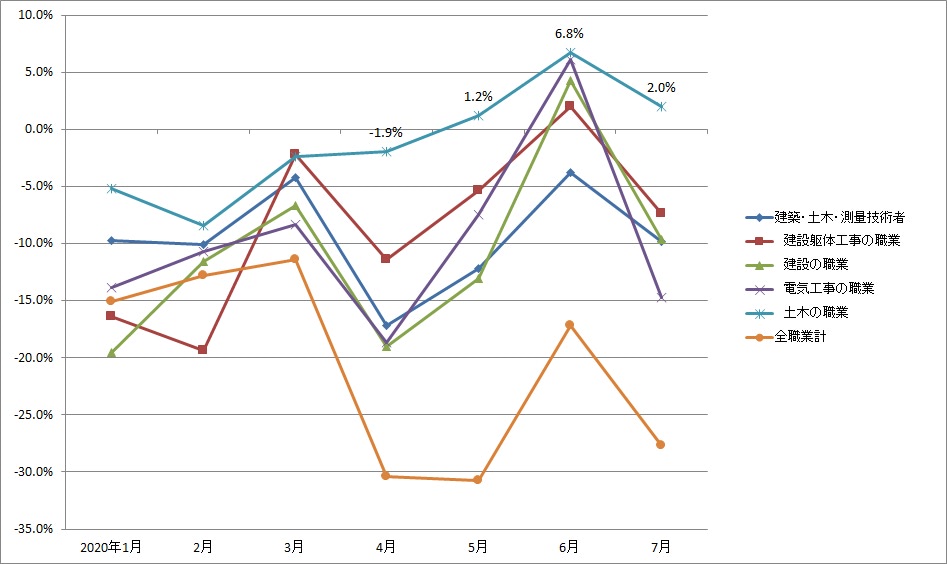 建設業に関連する職種別に新規求人数の対前年増減率の推移を見ると、各職種ともに全職種計よりも減少率は低くなっています(図表②)。特に、土木作業員等の土木の職業については、5月(1.2%増)、6月(6.8%増)、7月(2.0%増)と増加しており、新型コロナウイルス感染症拡大後も人材需要は前年を上回っています。