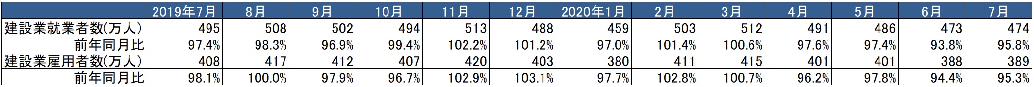 建設業界の最新雇用関連データ(2020年9月1日総務省・厚生労働省公表)