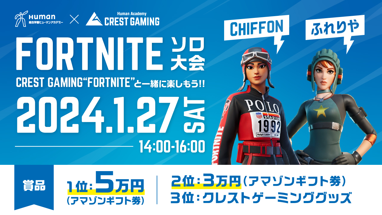 教育事業を手掛けるヒューマンアカデミー株式会社(本社:東京都新宿区、代表取締役:川上 輝之、以下「当社」)が運営する全日制専門校の総合学園ヒューマンアカデミーe-Sportsカレッジにて、世界で活躍するプロ選手を育成する一貫として、プロeスポーツチーム「Human Academy CREST GAMING FORTNITE」より、Chiffon選手、ふれりや選手を迎えた、「FORTNITE 」を開催します。プロのeスポーツ選手と一緒に楽しめるこの大会は、eスポーツに未来を感じ、スキル向上を目指す方にとって実践的な技術を磨くことができるイベントとなります。