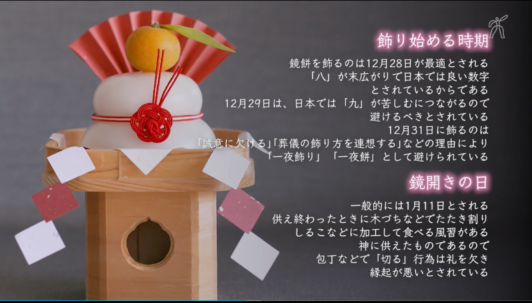 鏡もちの他、お正月、初日の出、お年玉、門松、しめ縄、おとそ、おせち料理、こままわし、たこあげなど、全18項目の意味やいわれ、やってはいけないことなどが習得できます。