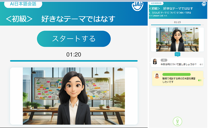| ●1987年の開校以来30,000名以上の卒業生を輩出してきた当校の教育メソッドと生成AI技術を組み合わせ、学習効果を最大化したAI日本語会話Webアプリ「HAi-J (ハイジェイ)」 ●面接や「報・連・相」といったビジネスシーンで必要とされるやり取りだけではなく、「介護」や「飲食」など業界別の会話練習も可能 ●学習者の日本語レベルを客観的に評価する機能を搭載し、「日本語教育の参照枠」(※2)に準拠した評価が可能 |