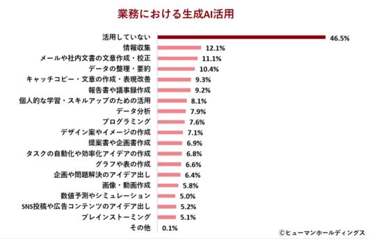 「業務における生成AIの活用状況」を尋ねたところ、46.5%と半数近くが活用していないと回答しました。情報収集(12.1%)、文章作成や校正(11.1%)、データ整理・要約(10.4%)などに利用している人も一定数いますが、まだ実務で広く活用されているとは言いにくく、これは、前述したZ世代の「タイパよく働きたい」「効率的に業務を進めたい」という意識とは対照的です。効率化や時短への関心は高いものの、現実の業務では生成AIの活用が浸透しておらず、実際の行動にはつながっていない状況が浮き彫りになりました。また、個人的な学習やスキルアップに活用している人も8.1%にとどまり、自己成長の手段としてのAI活用もまだ限定的です。