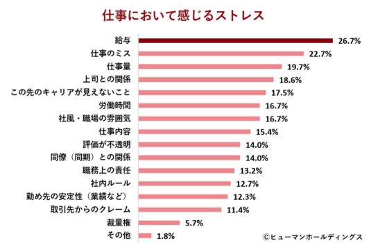 仕事におけるストレスの要因として最も多かったのは「給与」(26.7%)、次いで「仕事のミス」(22.7%)、「仕事量」(19.7%)でした。さらに「上司との関係」(18.6%)や「この先のキャリアが見えないこと」(17.5%)も上位に入り、報酬や業務量、上司・同僚との関係など、生活や将来に直結する要素が大きなストレス源であることがうかがえます。