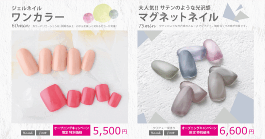 - 内容:初めてご来店の方にジェルワンカラーやマグネットネイルを特別価格でご提供。