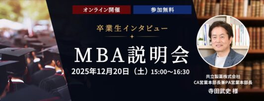 2025年第12回目となる今回は、動物用医薬品メーカーである共立製薬株式会社にて、CA営業本部長 兼 PA営業本部長を務める卒業生が登壇し、MBA取得を決意された背景から、授業で得た学び、そしてMBAをどのように活用し、事業成長に貢献しているかなど、経験談を語ります。