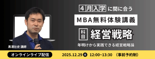 人生100年時代、またテクノロジー進化に伴うビジネス環境の激変を背景に、組織の力を最大限に生かすマネジメント力や経営スキルへの需要が高まっています。特に、年末は多くのビジネスパーソンが次年度の目標や戦略を再検討する時期です。 当社では、MBA取得をお考えの方や、現職でのスキルアップ・キャリアチェンジを目指す方を対象に、来年に向けた具体的な学びの第一歩として、本プログラムの特徴である実践的な経営戦略論と、MBA取得者のリアルな声を聴ける場を提供するため、本イベントを開催いたします。