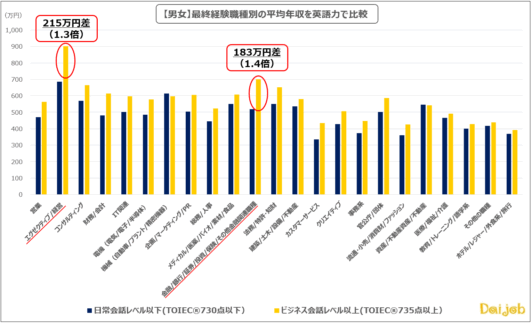 次に大きな差が開いたのは、「金融/銀行/証券/投資/保険/その他金融関連職種」で、1.4倍(183万円差)。高度な金融商品(ストラクチャード・ファイナンスやESG投資など)は、海外の専門家や法務・税務チームと連携して組成されることが多いため、英語力の有無によって年収差が開くと推測します。