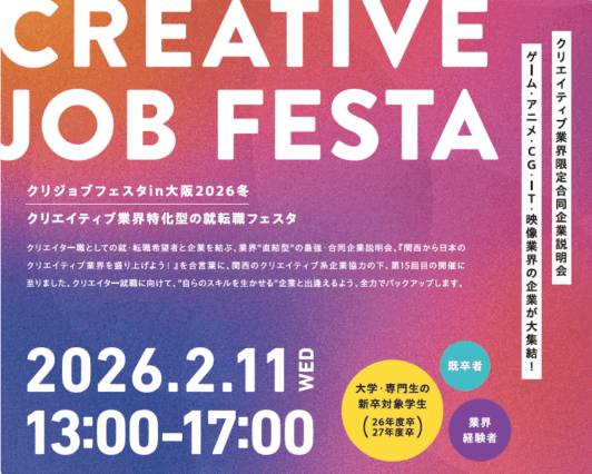 教育事業を展開するヒューマンアカデミー株式会社(本社:東京都新宿区、代表取締役:今堀健治、以下「当社」)の全日制専門校「総合学園ヒューマンアカデミー大阪心斎橋校」ではクリエイティブ業界を目指す求職者と企業をつなぐ就転職フェスタ 「クリJOB就転職フェスタ in 大阪 2026冬」 を2026年2月11日(水・祝)に開催いたします。本イベントでは、大手企業や注目のクリエイティブ企業が多数出展し、求職者と直接対話できる貴重な機会を提供します。