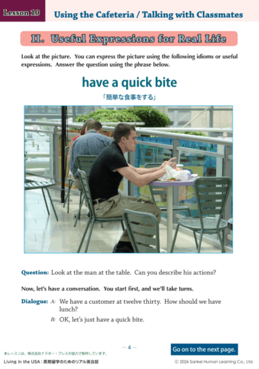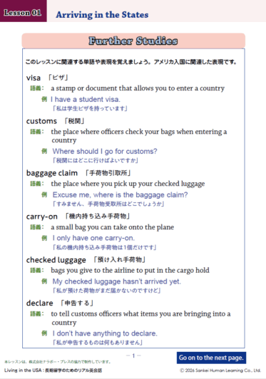 産経ヒューマンラーニング株式会社(本社:東京都新宿区、代表取締役:中谷友紀、以下「当社」)は、長期留学や海外渡航を控える方を対象に、現地でのスムーズな生活を支援するオンライン英会話教材『Living in the USA ~長期留学のためのリアル英会話』の提供を開始いたします。本テキストは、入国審査から大学生活、さらには現地でのトラブル対応まで、1年間のアメリカ生活をストーリー形式で体験しながら、知識としての英語ではなく、無意識に「使う」ための「生活英語」を習得することを目指した実践的プログラムです。