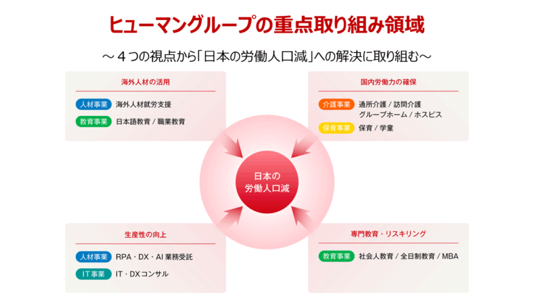 ヒューマングループはこれまで、教育を中核に、人を育て、社会に送り出す事業を通じて、社会課題の解決に取り組んできました。国内では、少子高齢化による労働人口の減少が加速しており、企業の人材確保や国内経済の持続的成長における大きな課題となっています。このような社会的背景のもと、「海外人材の活用」「国内労働力の確保」「生産性の向上」「専門教育・リスキリング」という4つの視点を軸に、多角的に課題解決サービスの提供に取り組んでいます。この取り組みを一層前進させるため、このたび、グループ内の経営資源を再編し、「海外人材活用」の領域における機能集約と役割の最適化を図ることで、グループのグローバル人材採用力を強化します。