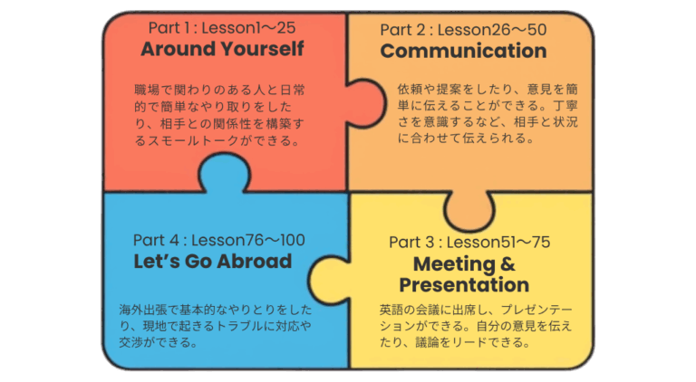 本コースでは、各レベル(A1〜B1)の100レッスンを4つのカテゴリに分類しています 。これにより、第1回から順に受講するだけでなく、自身の強化したい分野に合わせてレッスンを選択することが可能になりました。
