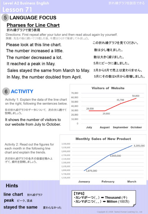 また、ビジネスの現場で意思決定の鍵となるのは「数字」の扱いです。特に大きな数字の表現は、日本語と英語で桁の区切り方が異なるため、中級者にとっても聞き取り・発話ともに難関となります。本カリキュラムでは、こうした数字の扱いや、オフィスで多用されるグラフ・図表の説明に関する「型」を習得し、正確に情報を伝える力を養います。