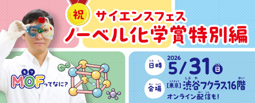 教育事業を展開するヒューマンアカデミー株式会社(本社:東京都新宿区、代表取締役:田中知信、以下「当社」)の児童教育事業「ヒューマンアカデミージュニア」は 、2026年5月31日(日)にサイエンスフェス ノーベル化学賞特別編として「体験!ノーベル化学賞の世界」を開催いたします。本イベントは、同社が運営する科学教室「サイエンスゲーツ」によるスペシャルプログラムで、受賞研究を支えた専門家が登壇します。子どもたちが世界で注目されている最先端科学「MOF(金属イオンと有機分子から成る、ジャングルジムのような空洞をもった多孔性物質)」をテーマに、クイズや実験を通じて科学の楽しさと驚きを体験できるプログラムを提供します。会場(渋谷)とオンラインのハイブリッド形式で、全国の親子が無料で参加可能です。