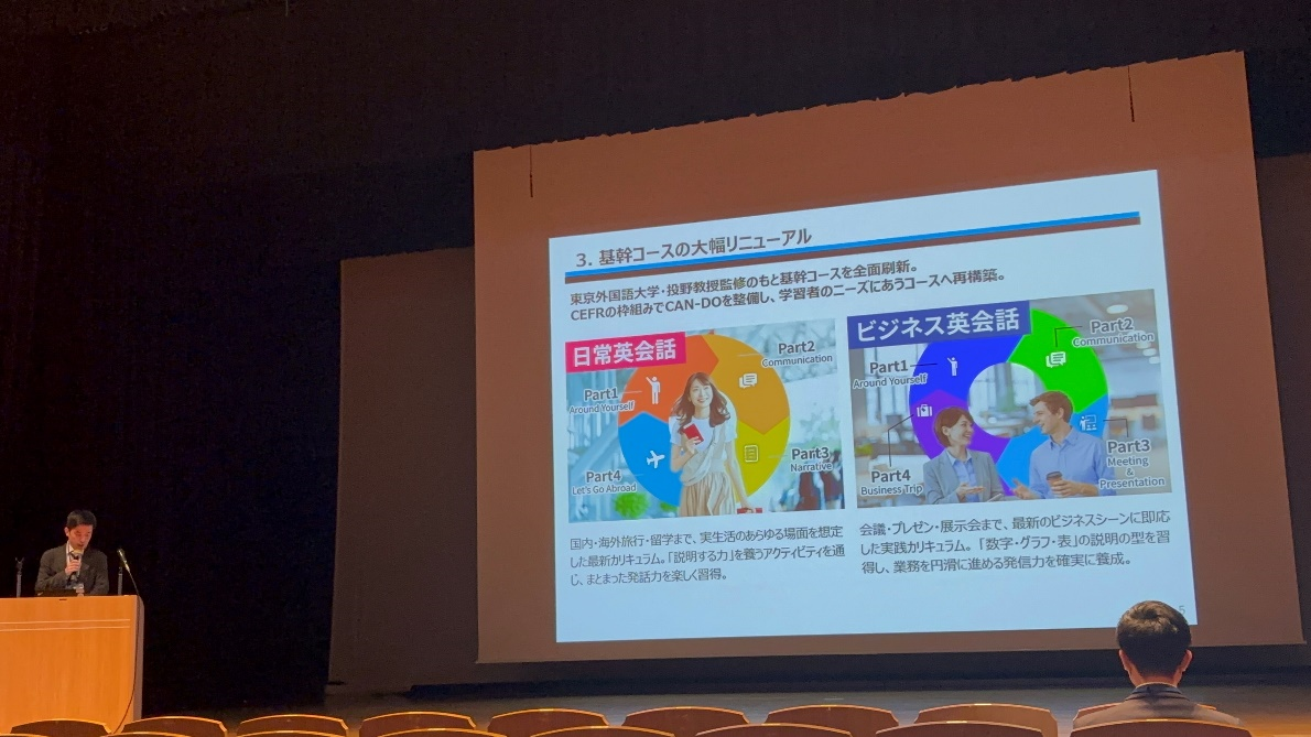 当日の企業プレゼンでは、当社の教務部門責任者 の 六波羅 人聖(ろくはら じんせい)が登壇し、投野教授の改訂監修を受けた「日常英会話」および「ビジネス英会話」の再構築プロジェクトにおける商品設計プロセスを解説いたしました。