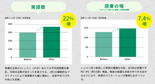 検証の 結果 、 受講生全体 高校 1〜2年生 36名、全5回実施)の1レッスン(25分)あたりの平均発語数 が 22%増加、さらに1レッスン内で使用される単語の種類(語彙の幅)も平均7.4%(約10語)増加するという成果を記録しました。