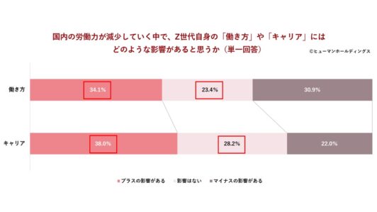 この傾向は個人の意識にも反映されており、自身の「キャリア」にプラスの影響がある、または影響はないと答えた「非ネガティブ層」は合わせて66.2%に上ります。同様に「働き方」への影響についても、計57.5%がプラスの影響がある、または影響はないと回答しました。労働力減少を単なる社会問題として悲観せず、むしろ自分らしいキャリアを築くための好機と捉える、Z世代ならではのたくましさが伺える結果となっています。