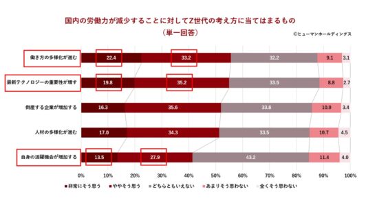 国内の労働力が減少していくことに対し、「働き方の多様化が進む」(55.6%)や「最新テクノロジーの重要性が増す」(55.0%)など、Z世代の社会の変化を前向きに捉える回答が半数を超えました。また、「自身の活躍機会が増加する」との回答も41.4%に達しており、社会の危機を新時代のチャンスと捉えるZ世代の姿が浮き彫りになりました。