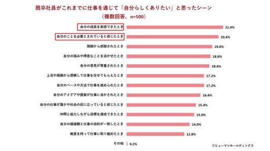 Z世代のうち、26卒を除く既卒の500人がこれまでに仕事を通じて「自分らしくありたい」と思ったシーンは、「自分の成長を実感できたとき」(21.4%)が最多となりました。次いで「自分のことを必要とされていると感じたとき」(20.4%)、「周囲から感謝されたとき」(19.0%)、「自分の強みや得意なことを活かせたとき」(18.6%)が続いており、自己の成長や存在価値が自分らしさの源泉となっている様子がうかがえます。