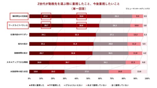 Z世代の勤務先を選ぶ際に重視したことは、最も多かった回答が「福利厚生の充実度」(60.9%)となりました。次いで「ワークライフバランスのとりやすさ」、「仕事内容のやりがい」、「給与の高さ」、「勤務時間の長さ」を全体の半数以上が重視しています。「スキルアップできる環境かどうか」も47.6%が重視しており、個人の成長と環境の両立を求める実態が見て取れます。