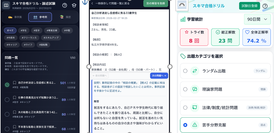 「スキマ合格ドリル」は国家資格キャリアコンサルタント試験の傾向や当社テキスト、講座情報をもとに、AIによる問題作問と評価を実施(学科:苦手分野判定、論述:答案評価・フィードバック)しています。受験の中心層である40~50代の現役世代が、忙しい合間(スキマ時間)に効率よく学習できるツールとなっています。