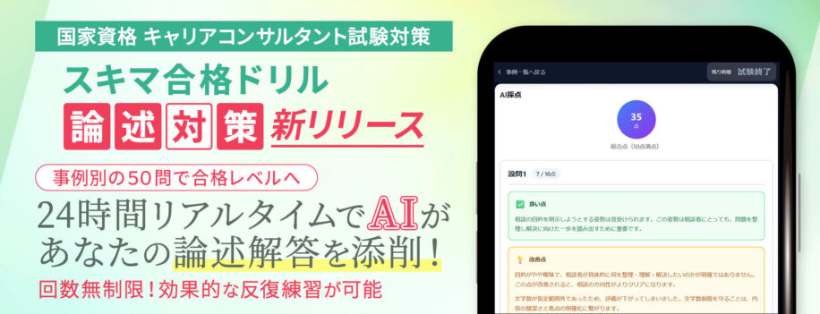 教育事業を展開するヒューマンアカデミー株式会社(本社:東京都新宿区、代表取締役:田中知信、以下「当社」)は、国家資格キャリアコンサルタント試験対策ツール『スキマ合格ドリル』の一般販売を2026年5月より開始いたします。本サービスは、受講生の要望に応え、業界初となる「AI論述添削機能」を新たに搭載。先行提供していた「学科版」での高い成果(合格率向上・高い利用率・満足度)を背景に、多忙な受験生の「学習時間の確保」と「実践演習の不足」という課題を解決します。