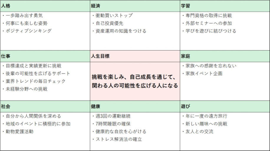 「なりたい自分」を明確にし、実現するために必要な事項を可視化するSELFingのサポートツール。中心に人生目標や「なりたい自分」の姿を書き、実現するために必要な要素を周囲の8マスに、人生を構成する8大分野「健康」「仕事」「経済」「家庭」「社会」「人格」「学習」「遊び」に分けて書きこむフレームワーク。自らデザインする人生の“設計図”としてヒューマングループ各社で導入されている。