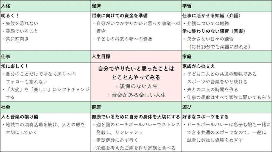 「なりたい自分」を明確にし、実現するために必要な事項を可視化するSELFingのサポートツール。中心に人生目標や「なりたい自分」の姿を書き、実現するために必要な要素を周囲の8マスに、人生を構成する8大分野「健康」「仕事」「経済」「家庭」「社会」「人格」「学習」「遊び」に分けて書きこむフレームワーク。自らデザインする人生の“設計図”としてヒューマングループ各社で導入されている。