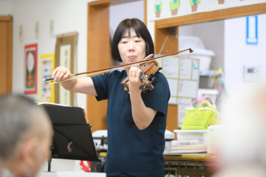 実は、復帰が決まった直後に乳がんが発覚し、左胸の全摘出手術を受けました。医師からは、長期休養やヴァイオリンが持てなくなる可能性を指摘されました。しかし、術後の経過がよく、2週間後には職場復帰。1ヶ月後には、ヴァイオリンも無事に弾くことができました。復帰のはやさに周りの人たちは驚いていましたが、私はとにかく働きたい、そして演奏したい。という気持ちが強くありました。介護士として、音楽療法士として働くことが、なりたい自分そのものなのだと感じています。