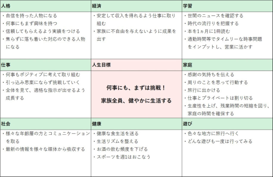 「なりたい自分」を明確にし、実現するために必要な事項を可視化するSELFingのサポートツール。中心に人生目標や「なりたい自分」の姿を書き、実現するために必要な要素を周囲の8マスに、人生を構成する8大分野「健康」「仕事」「経済」「家庭」「社会」「人格」「学習」「遊び」に分けて書きこむフレームワーク。自らデザインする人生の“設計図”としてヒューマングループ各社で導入されている。